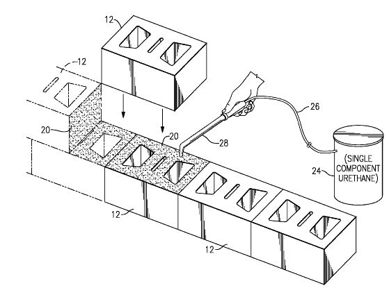 Why it is interesting: Apparantly using PU instead of Portland cement-based mortar results in walls with a higher tensile strength. This is useful during construction (when walls can be easily blown over by wind) or for prefab systems where wall elements have to be lifted and transported. The idea is not new. The only major difference with the prior art being that this case claims one component moisture curing systems. Prior art US20050096411 was not granted and was continued in US20110016814.