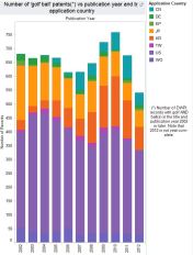 But what is really interesting – or at least remarkable- is the sheer number of golf ball patent applications published each year. More than 7500 were published during the last 10 year (see graph). About half of these applications are from the US, the rest mostly from the East: Japan, Korea and since 2005 also from China.