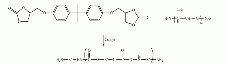 “Gist”: Bis(cyclic carbonate) compounds are produced by reacting bisphenol-A diglycidylether with CO2. These are then reacted with diamine oligomers (EO-PO and/or PDMS) to produce amine ended β-hydroxy-PU prepolymers which in turn are capped with acrylates to make a UV curable system useful for coating fabrics.