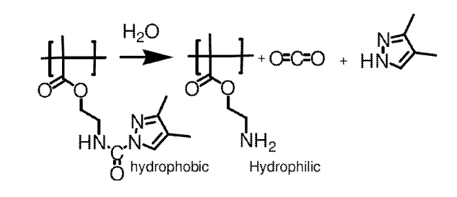 Why it is interesting: Conventionally “self-cleaning” surfaces are produced using hydrophobic coating compositions resulting in surfaces with low contact angles with respect to water. The current case claims that highly hydrophilic surfaces also show a self-cleaning effect. An emulsion-polymerized polymer with blocked-isocyanate side groups is used as a coating composition. After the coating is applied the side groups are deblocked by atmospheric moisture resulting in (hydrophilic) amine groups. In an example 2-methyl-acrylic acid 2-isocyanatoethyl ester blocked with 3,5-dimethylpyrazole was emulsion polymerized and, together with additives, used as a coating composition.