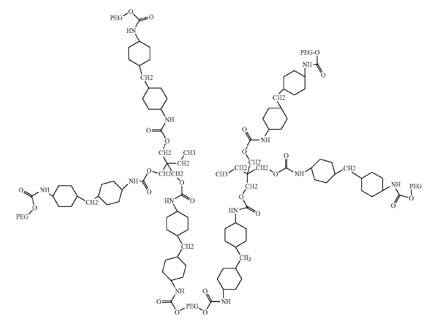 Why it is interesting: A low MW ‘core’ molecule with an OH functionality of up to 6 is reacted with a surplus of diisocyanate to form an NCO ended prepolymer. The prepolymer is then reacted with a suplus of a polyethylene glycol (PEG).  Reactants and ratios are chosen such that the average MW of the resulting product is less than about 10,000 and is water soluble or at least water dispersible. In an example trimethylolpropane is reacted with dicyclohexylmethane di-isocyanate (H12MDI) and ‘capped’ with PEG 400,  resulting in a mixture of structures, one of which is shown below.  The star polymers are supposedly useful as surfactants for use in detergents etc..